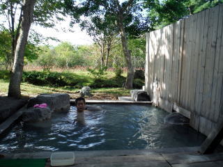 露天風呂は約4名が入浴できそうな大きさで、加水された温泉が使用されています。まず、目に入るのが男女の浴槽を仕切る木の壁。 かつては混浴だったそうです。
