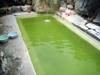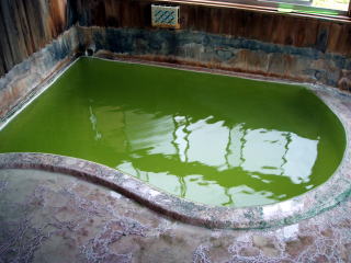 脱衣所から浴槽をのぞいてみると,10人くらい入れる浴槽に,きれいな黄緑透明の湯が満たされています。「こりゃーすげー」