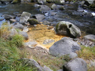 そばを流れる川にも温泉が湧出していて,黄色い析出物が底に堆積していました。