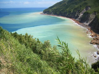 展望台から北の海岸線を見ると,温泉成分で海水がペパーミントグリーンのような色に変色していました。