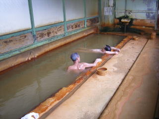 内湯は,写真のように細長く,黄土色に濁っています。