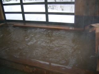 内湯は7,8人入れる四角い浴槽が2つ並んでいて,湯口から源泉がかなりの勢いで右側の浴槽に注がれています。赤というよりは茶色です。