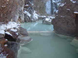 この日は,雪混じりの天気で,さすがに奥には数秒しか入りませんでしたが,青みがかった源泉と,その奥の滝とのロケーションには,寒さも忘れて見入ってしまいました。
