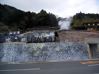 別府の明礬温泉街には,湯の花を採取する名物の湯の花小屋があります。それを見学しつつ,そこから山道を入り,鍋山の湯に向かいました。