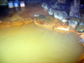 黄土色にコーティングされた浴槽にかなりの勢いで源泉が注がれています。それにしてもすごい量です。