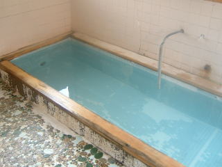 お風呂は横に長く中央にあるパイプから源泉を沸かした湯が流れ出していた。