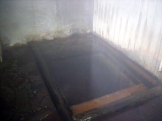 浴槽は木枠で3人位入れる大きさ。壁の下は女湯とつながっています。