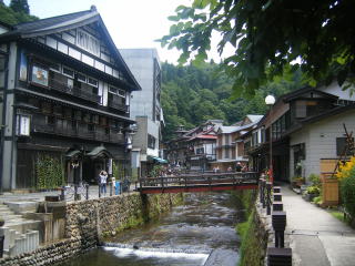 銀山川を挟んで,レトロな旅館が建ち並ぶその景観は一見の価値があります。昭和初期にタイムスリップしたようです。