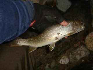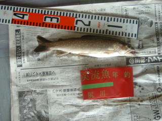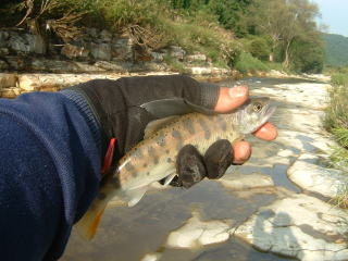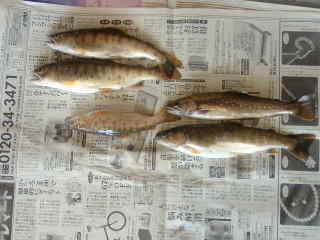 はじめはウグイばかりでしたが,粘っているとウグイと違う手応えが・・・。なんと33センチのイワナが釣れました。もっとでかいのが必ずいると思い