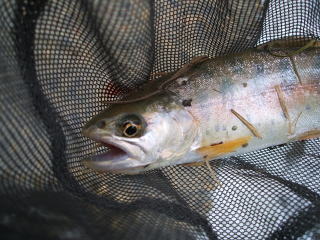 最初に釣れてきたのは,なんとひれピンのニジマス。