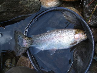 入れると,なんと40センチのひれピンのニジマス。たぶん,釣り大会で放したものが野生化したのでしょう。竿は「翠微」なので無事