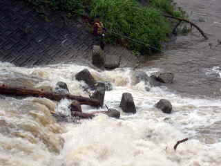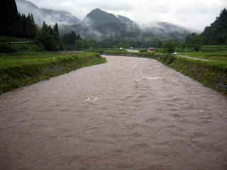 夜明けとともに見えてきた野尻川は,褐色の土濁り。