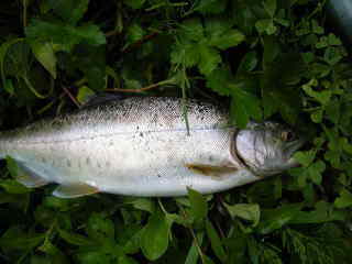 自分がやっと数尾釣ったあと,同行のまっちゃんが38センチのイワナを釣りました。