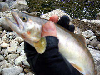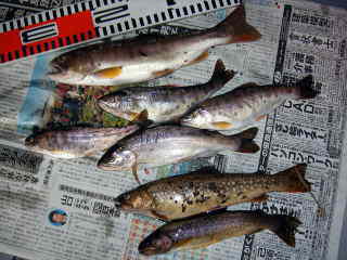 まず,いつもの流れ込みと沢で3尾のヤマメと骨酒用のイワナを釣り,そのあとは,大物狙いに下流へ。