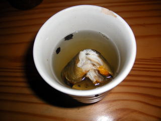 帰ってから,20センチのイワナを骨酒に。