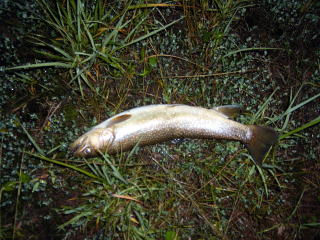 魚の頭を水面に出し,なんとか川に下りて網を用意。