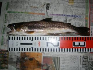 するとこちらも「あたり」です。あわせると,大物の手応えです。慎重に釣り上げ,計ると32センチのイワナでした。当たりがあたりをよんだようです。