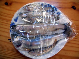 今回の釣果ですが,イワナ1尾,ヤマメ5尾,最大はヤマメ26㎝でした。いつものお皿で撮影,直径は24㎝あります。