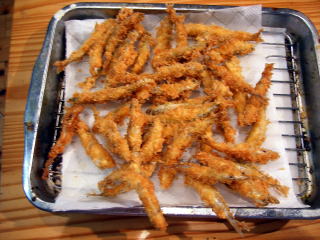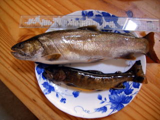 帰ってきてから,イワナは寿司と刺身に,ワカサギはフライに。