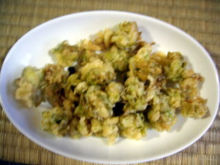 まっちゃんが採ってきたホップの実は天ぷらに。ビールの苦みが感じられます。