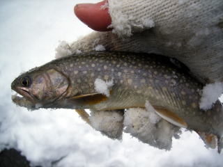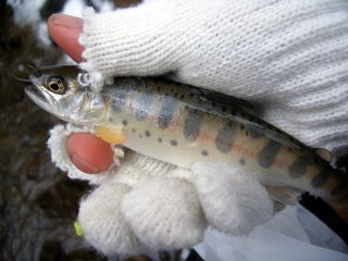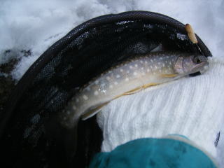 かかりました。2012年初イワナです。落とさないようにネットを用意しましたがうまく開かないし,久しぶりなのでおたおたしてしまいました。