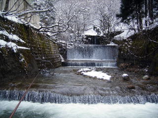 本日の温泉は大塩温泉です。最近温湯が好みになってきた自分にぴったりです。窓から外をのぞくと川底に沈んでいたたつみ荘の露天風呂が見えました。