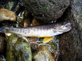 人が必ず入りそうな大場所のちよっと下流のよどみでようやく,かけがえのない1尾が釣れました。21㎝です。とりあえずよかったです。
