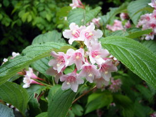 沢筋を林道が通っていて,いろいろな花が咲いていました。タニウツギの淡いピンクの花弁がきれいです。セミやタヌキにも出くわしました。