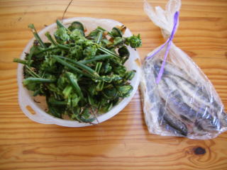 今回の収穫です。こごみは気持ち程度,イワナとヤマメは唐揚げ程度持ち帰ることができました。