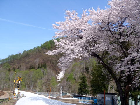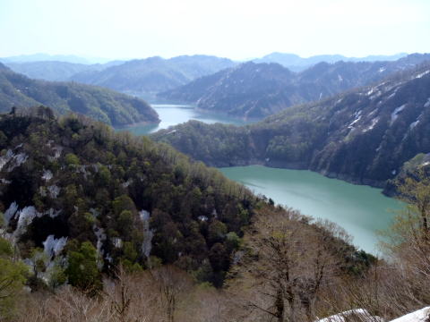 峠を越えると田子倉湖が見えてきます。ブナの新緑と山桜が青い空に映えます。しばらく見とれてしまいました。