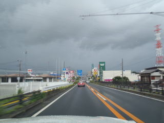台風の進路を見極め,お昼に出発しました。途中の空模様はいかにもという感じです。