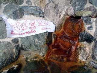 なかなか,可愛らしい手ぬぐいです。さっそく露天風呂の温泉の注ぎ口に広げて記念撮影。