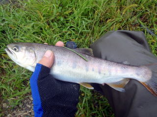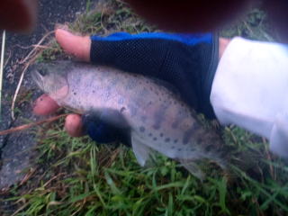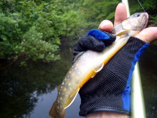 しょうがなく,不安でしたが6号のハリをつけて釣り始めたら軽く尺オーバーのヤマメがかかりました。