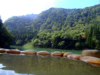 露天風呂にカメラを持ち込み,浴槽の水面近くのアングルから,露天風呂と只見川,その向こうの山と青空を撮りました。いい感じです。