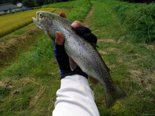 場所を変えて,釣っているとまたまたきました。こいつもでかいです。ヒューヒューと糸が鳴っています。なんとか取り込むと35センチのニジマスでした。