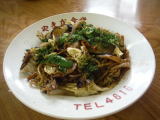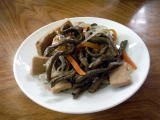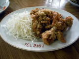 今回は、ソースカツ、焼きそばの他、鳥の唐揚げを一品増やし、瓶ビールは4本目です。完全に飲み会になってしまいました。ワラビの和え物をサービスして頂きました。
