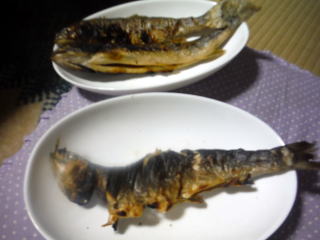 部屋でまず缶ビールを飲んだ後、夕食開始です。骨酒はイワナが大きかったので、まっちゃんがしっぽ、自分が頭と半分にしてありました。うまいです。