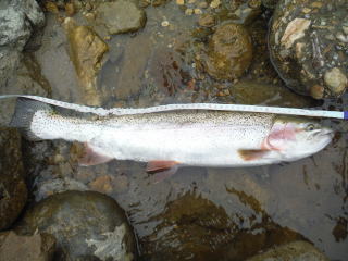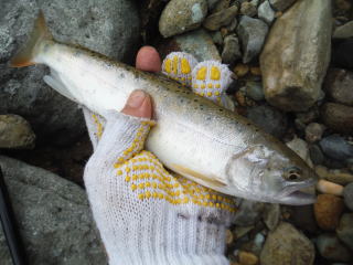 最初は本流で大物を狙いましたが,放流ものとわかるようなブヨブヨイワナが数尾。こんなイワナを釣りにきたのではありません。
