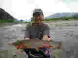 竿が満月のようにしなります。下流に引っ張られて川の中を必死に付いてくと左足のサンダルが半分脱げかかってしまいました。なんとかこらえ,いなしながら大声で杉さんに助けを求めます。