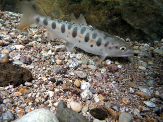 昭和村では大物ポイントを回ったのですがやはりつれません。たまたま沢で小型のヤマメがかかってきたので水中撮影です。イワナと比べてヤマメは落ち着きません。やっといい感じの写真が一枚撮れました。