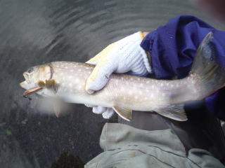 尾びれが手のひらほどのスーパーイワナも数尾。60越えか。ひれの白いラインまではっきり見えます。