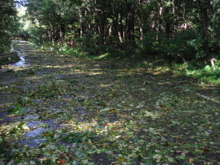 途中の道路はアスファルト面が見えないほど葉っぱが積もっていて、台風通過の後が残っていました。