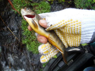 沢で釣れたイワナのおなかの色が、軍手の黄色い滑り止めと、全く同じ色です。
