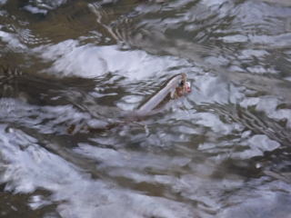 とりあえず骨酒用の沢で竿を出します。一投目いきなりあたり。でも空振り。二投目、つれました。半年ぶりのイワナです。小さめですがやっぱりうれしいです。きれいな魚体はまだサビがのこっており黒めです。