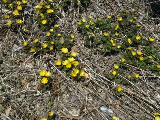 帰り、昭和村で福寿草の群落を発見。鮮やかな黄色です。