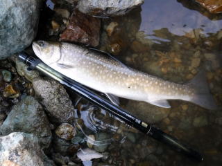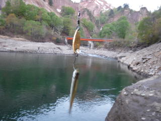 ワカサギミノーで20分くらいキャストしているといきなりのアタリ。とにかく慌てず丁寧に。を心で叫びながら時間をかけてやりとりをしました。しかし、残念ながらぎらぎらしていません。これはもしかしたらニゴイ?どうしようと思いましたが、上がってきた魚は斑点があります。鮭みたいなイワナです。でかいです。玉網に誘導しますがでかくてなかなか入りません。ここでバラしたらと思うと焦りましたがなんとか取り込むことができました。
