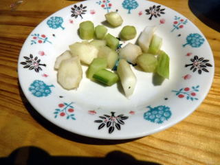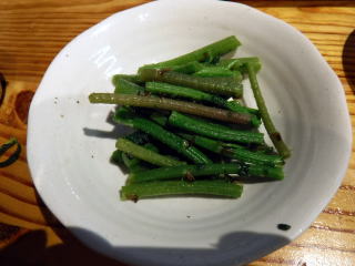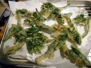 ウド芽の天ぷら、ウドの酢味噌和え、アイコのおひたしです。