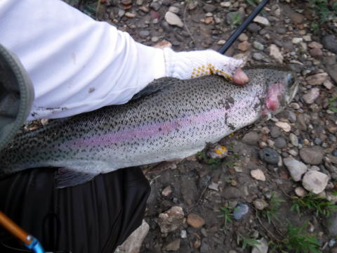 きました!大物です!かなりの重量感です。とにかく走る走る。7.2Mの竿でもタメが持ちません。約50メートル下流までついて行きやっと取り込めました。46㎝の大ニジマスです。カメラでビデオを撮ろうとしましたが、それどころではなかったです。