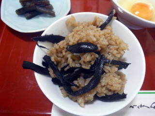 宿に戻ると、コウタケの炊き込みご飯の朝食です。しかもコウタケの量が半端ないです。3杯おかわりしてしまいました。
