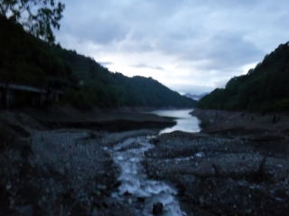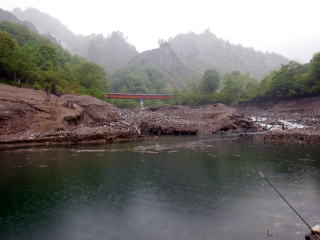 水位は493メートル。昨年大イワナを釣った時より5メーターくらい少ない感じです。思ってたより少ないです。それでも橋から歩いて3分くらいのところまでバックウォーターが来ていました。